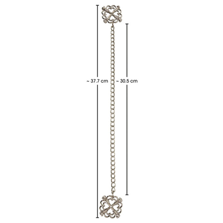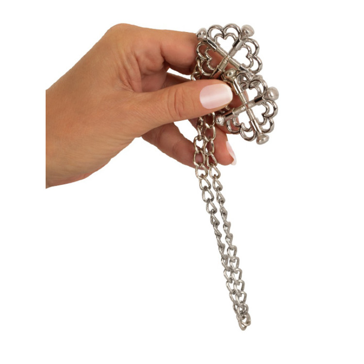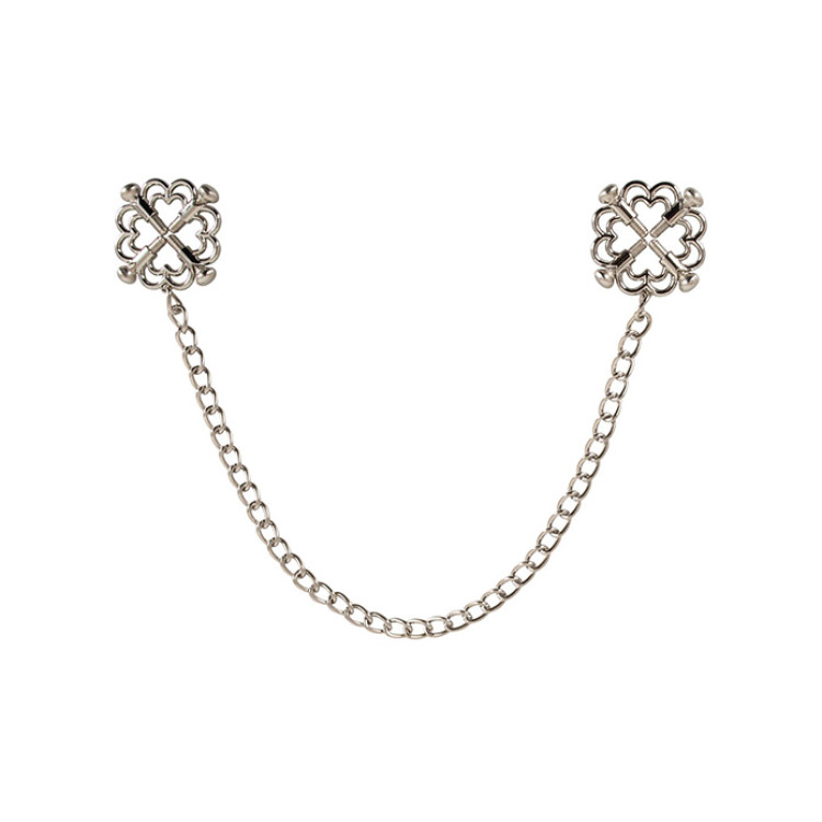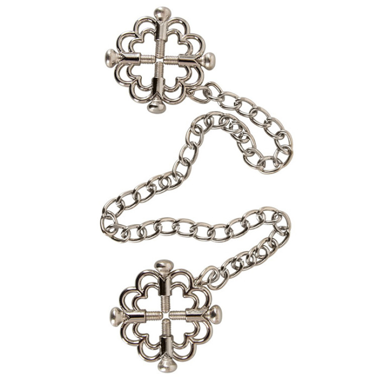 Dette frekke smykket festes rundt brystvortene og er koblet sammen med et lekkert kjede. De stilfulle klemmene holder brystvortene på plass med fire justerbare skruer, slik at du enkelt kan variere mellom lett til fast grep.