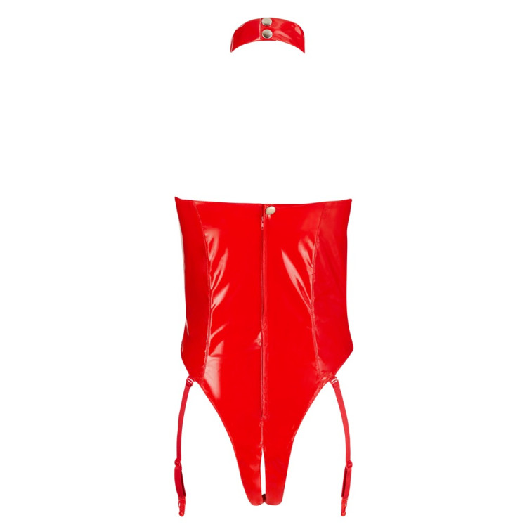 Nydelig body i lakk med ildrød farge. Bodyen har en innbydende åpen bryst og skritt-parti. Strømpestroppene gjør det enklere å feste dine favorittstrømper, men kan også tas av. Den åpne BHen har bøyler for lett støtte. Stroppene opp til collaret er justerbare med enkle trykknapper og stropper. Ryggen har en praktisk glidemiddel og trykknapp.