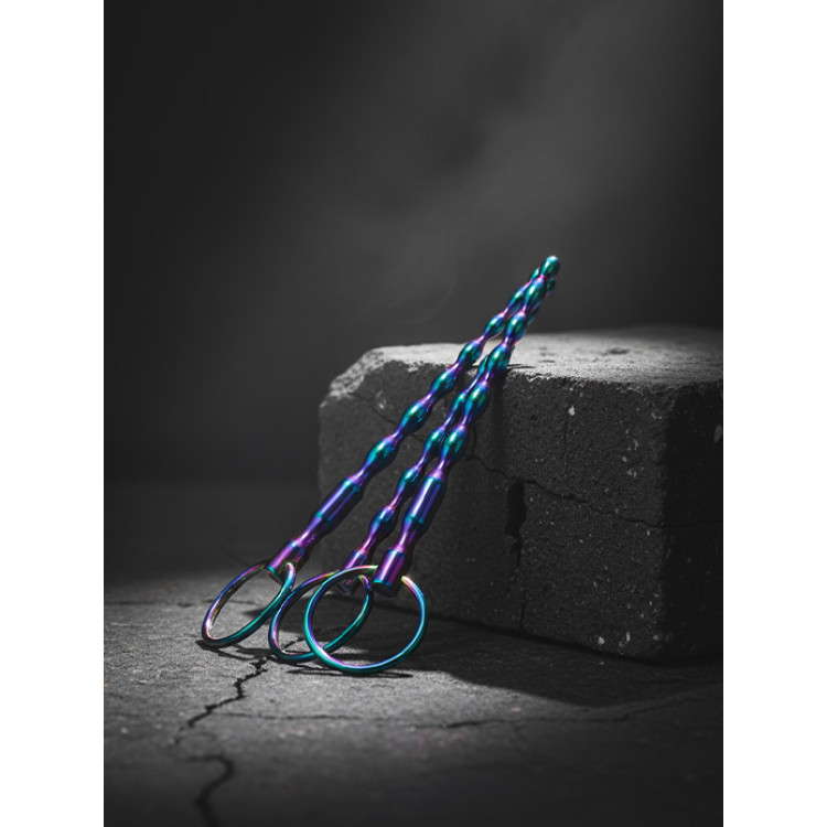 BQS Penispluggsett i regnbuefinish er et soundingsett for deg som virkelig vil kjenne hvordan hver bue og kule treffer nervene der det virkelig skjer. Glatt metall, bølgete form og en digg tyngde gjør at pluggen glir lettere på plass og nervene på innsiden svarer, dypt, intenst og umulig å ignorere.
