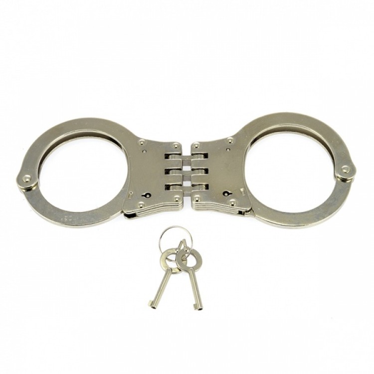 Trippelt hengslet politihåndjern. To nøkler medfølger.
