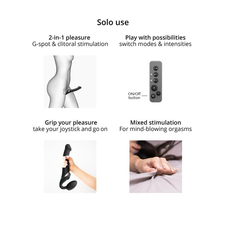 Strap-on-me lar den justere den korte delen ut i fra hvilken vinkel du ønsker at den skal og for å sitte best mulig. Den korte delen brukes vaginalt og holdes igjen av bekkenbunnsmuskulaturen, den gir deg samtidig en deilig g-punkt stimulering ved hjelp av kraftige vibrasjoner. Den lengre delen har en egen motor og vil gi din partner en deilig vibrasjon!